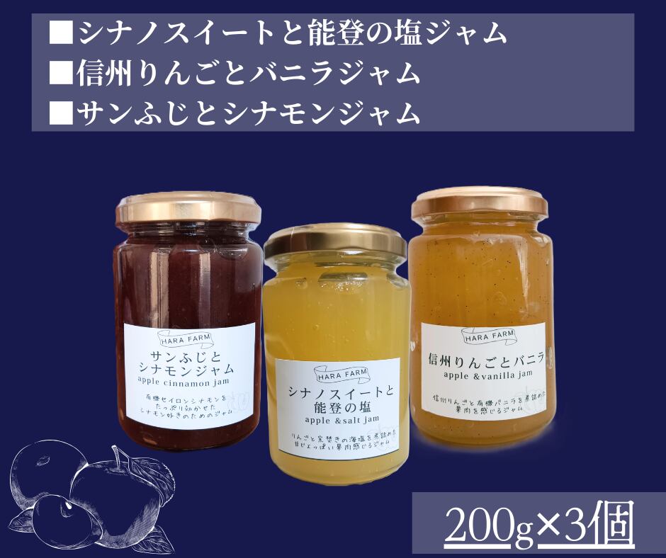 ・サンふじとシナモンジャム :りんご(長野県松川町産サンふじ)、砂糖(てんさい糖)、シナモン